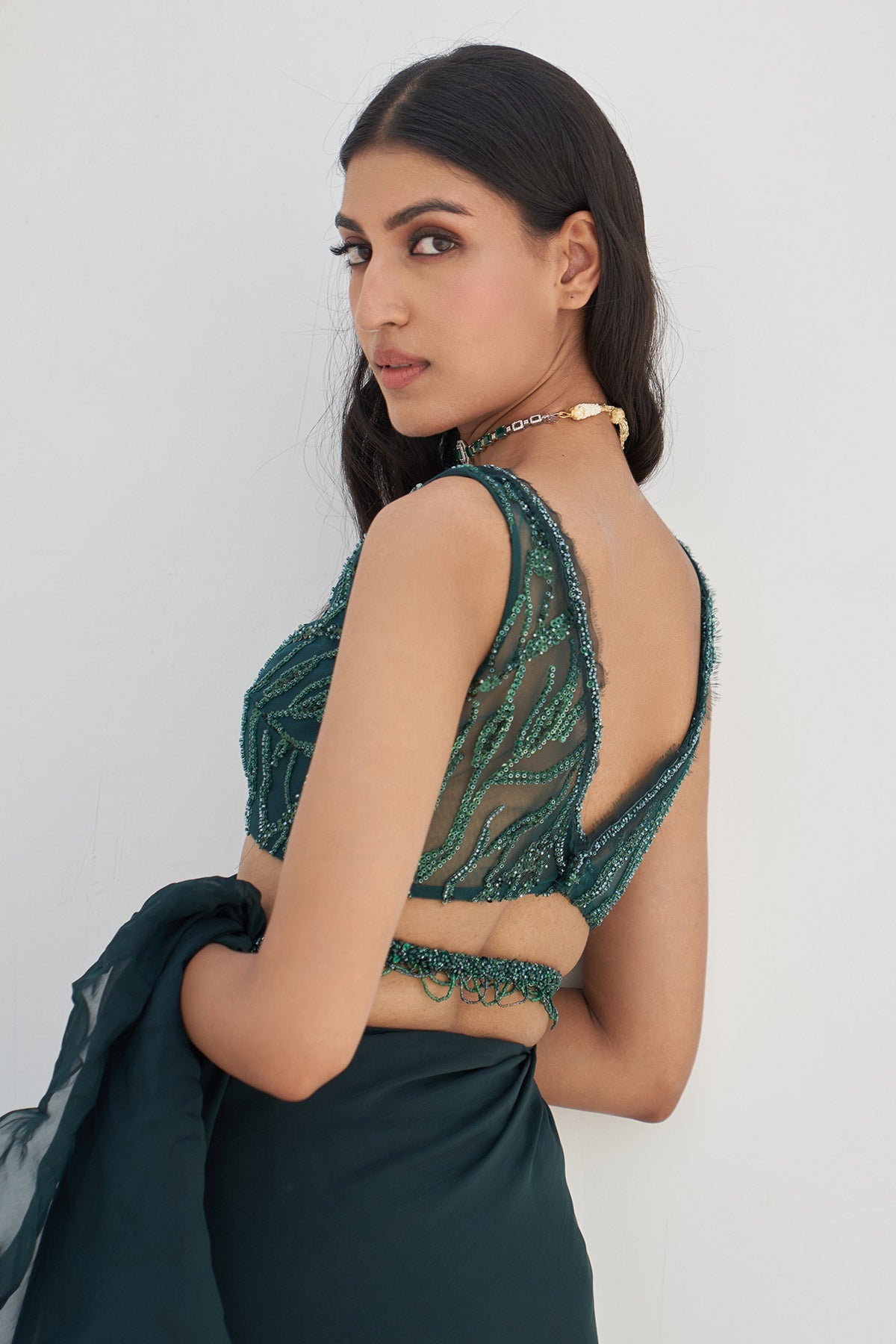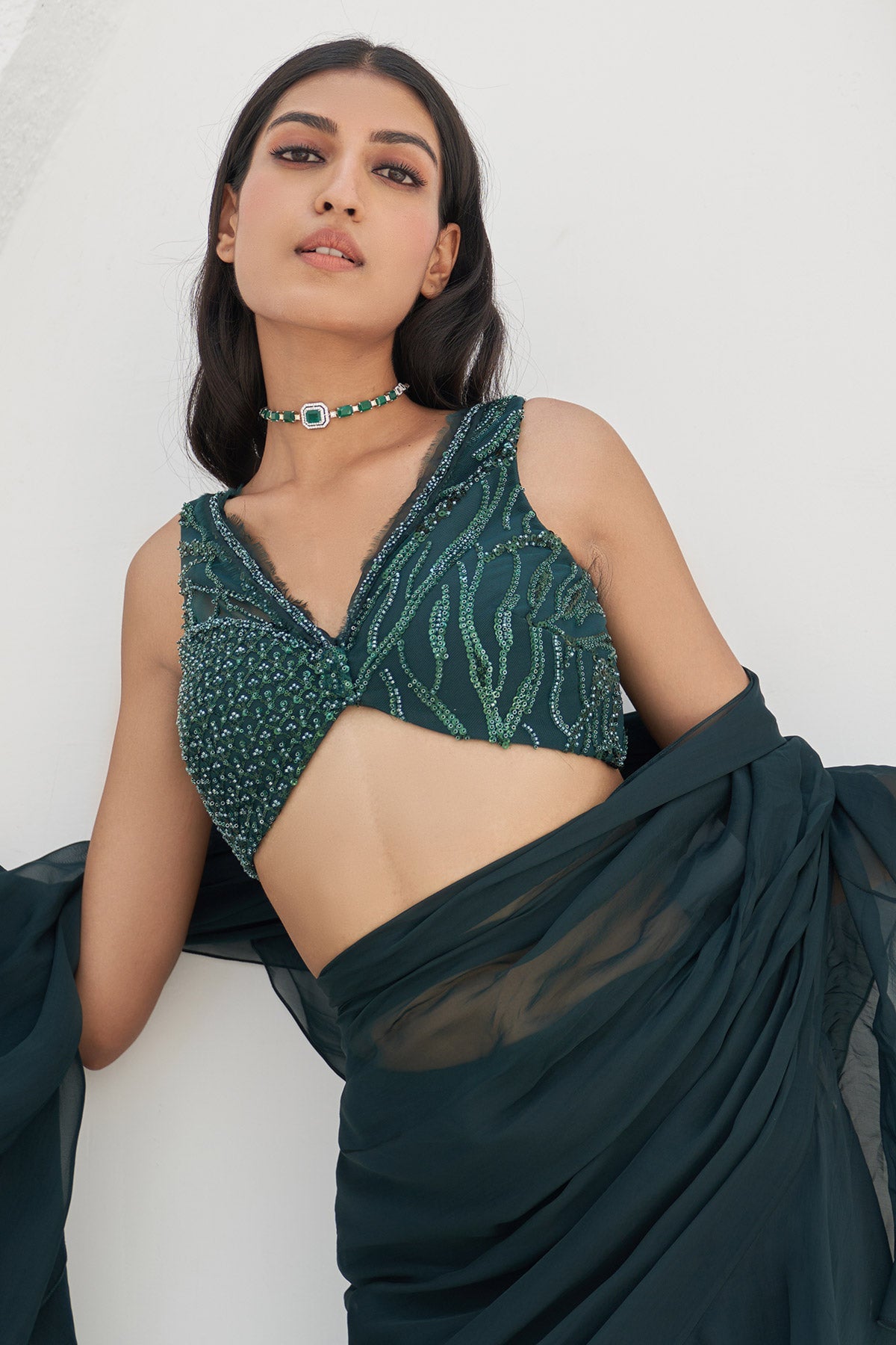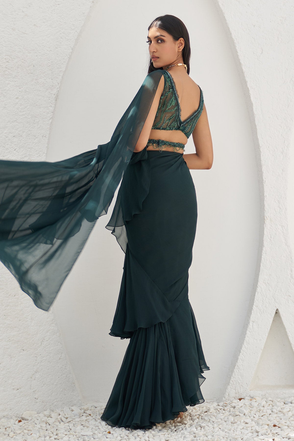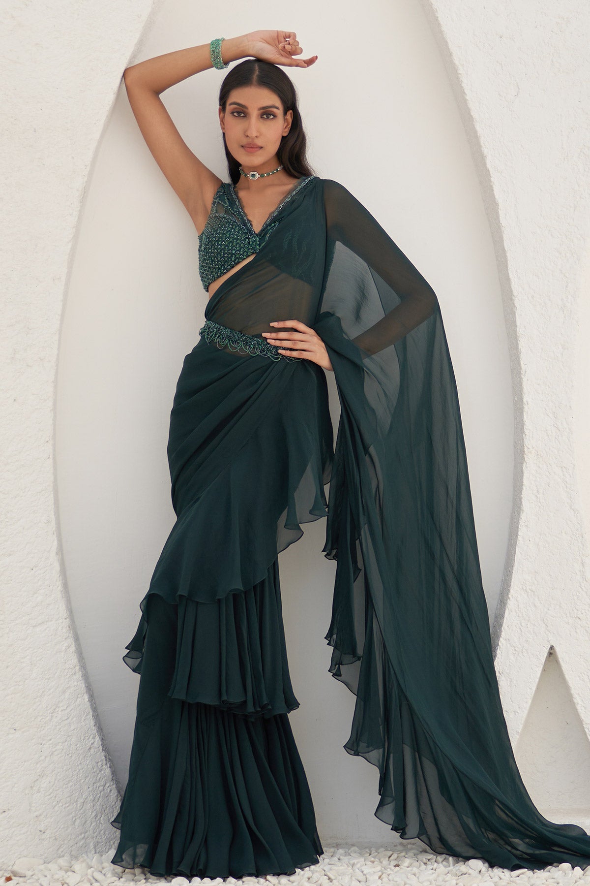 Embroidered Blouse with Ruffled Pre-Stitched Saree and Belt